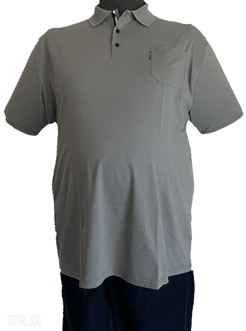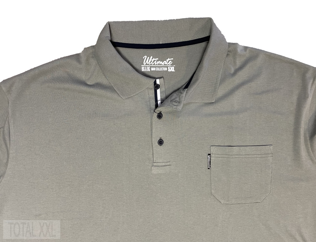kekiszínű rövid ujjú póló kötött gallérral, egy mellzsebbel