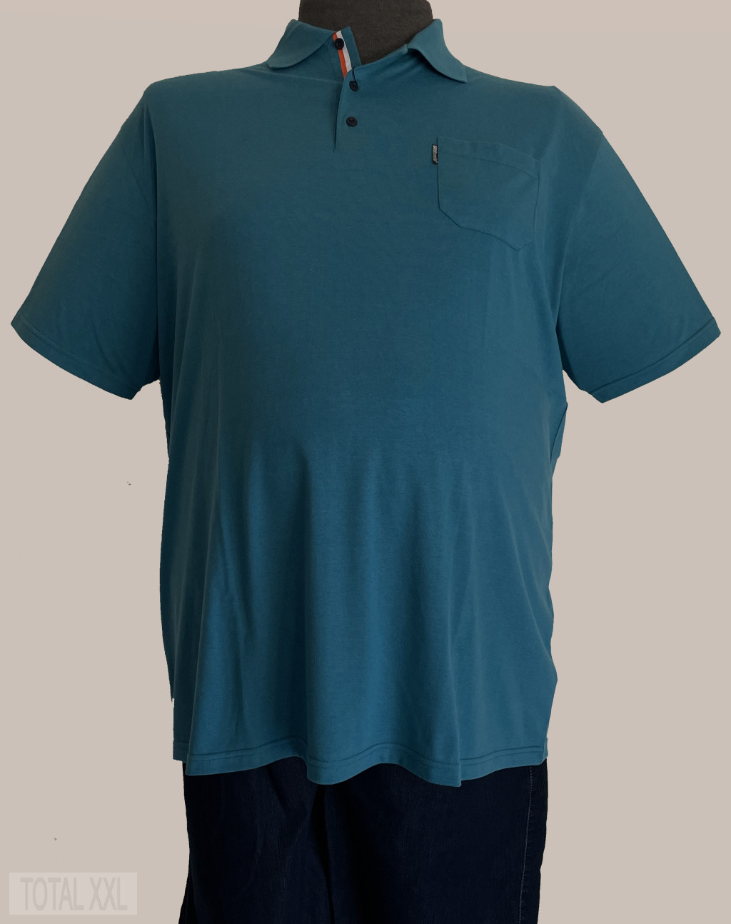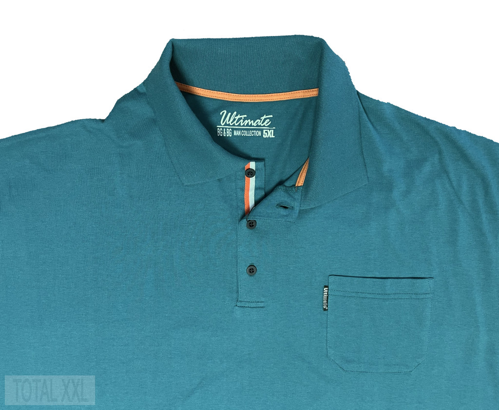 türkizzöld színű rövid ujjú póló kötött gallérral, egy mellzsebbel