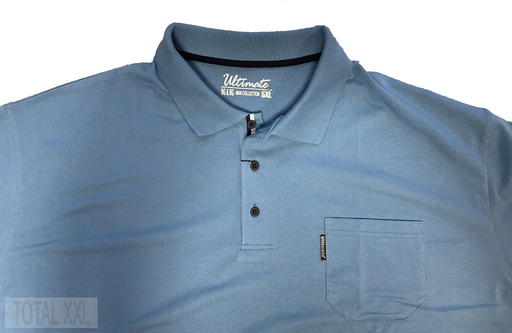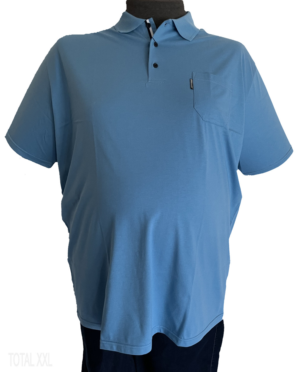 világoskék színű rövid ujjú póló kötött gallérral, egy mellzsebbel
